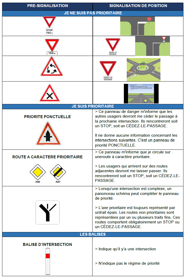 Une intersection c'est un lieu de jonction ou de croisement de deux ou plusieurs routes en un point et au même niveau (sans trottoir). Il en existe 5 types. Elles peuvent être gérées par une signalisation lumineuse ou non.