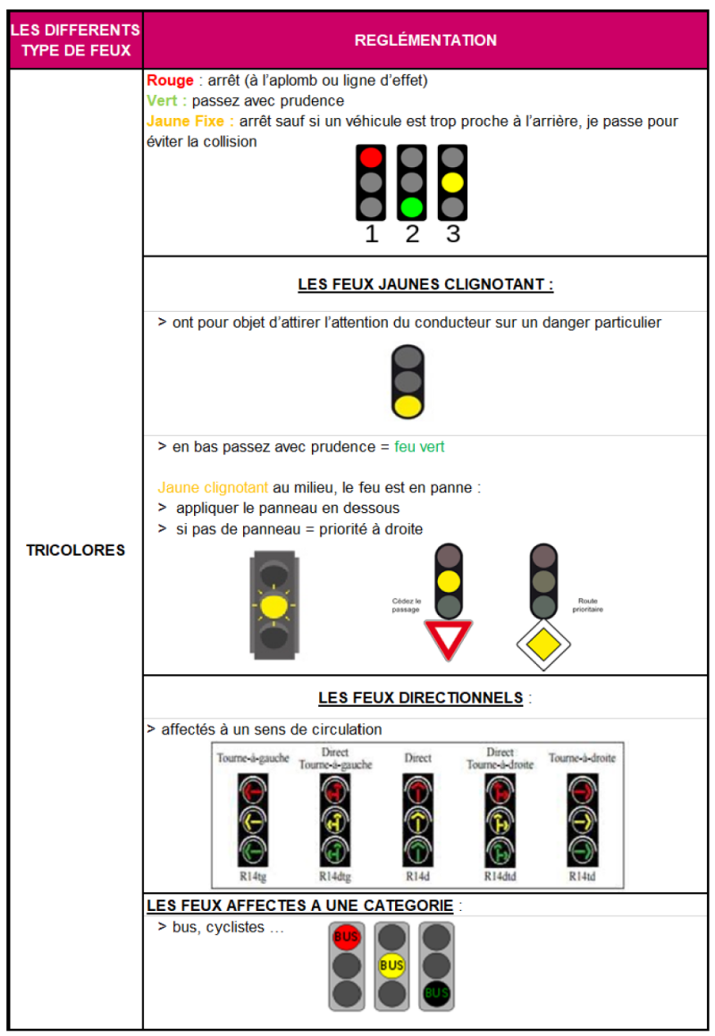 Les feux de signalisation lumineux réglant la circulation des véhicules sont verts, jaunes ou rouges. Les feux de signalisation jaunes et rouges peuvent être clignotants. Ils s'allument de façon cyclique dans l'ordre vert - jaune - rouge - vert, etc. sans clignoter. Ils sont destinés à tous les véhicules qui se présentent sur la chaussée.