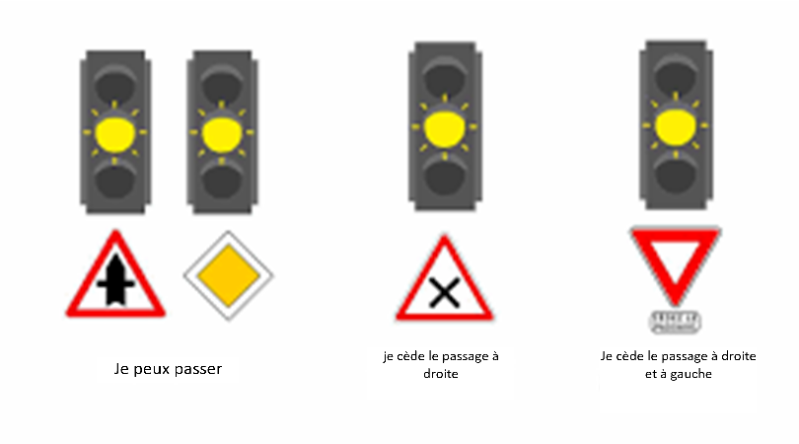 Lorsque le feu est jaune clignotant au milieu cela signifie qu'il est en panne. Dans ce cas on applique la règlementation du panneau qui est sous le feu. En l'absence de tout autre indication c'est la règle de la priorité à droite qui devra être appliquée.